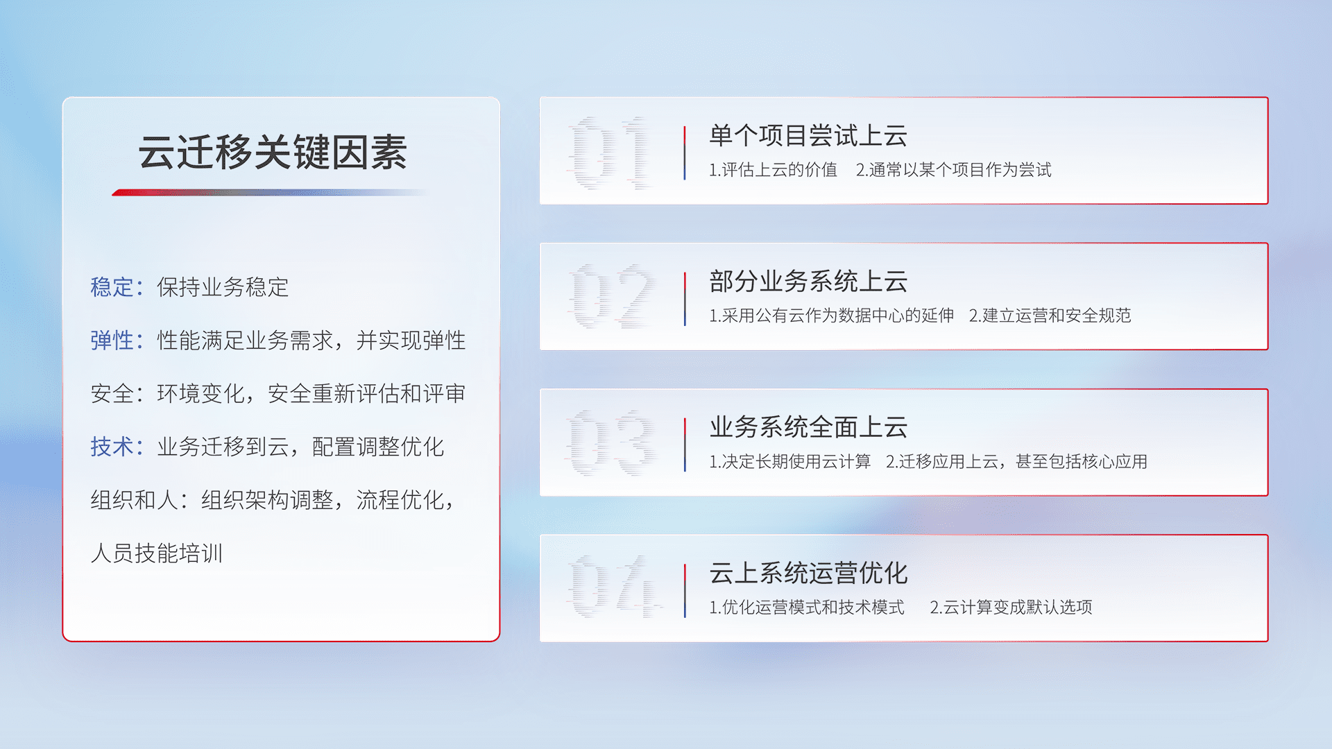 结合实际业务,,,从规划设计、、云平台选型、、、云原生改造、、、、数据迁移、、、、集成交付,,迁移全过程为客户识别最佳上云路径,,,,做好风险识别管理,,,设计网络架构、、、身份权限、、、安全审计合规、、、操作审计、、日志审计、、、监控告警策略、、多站点容灾设计等,,对云上基础设施进行整体规划,,提升IT治理水平,,,以满足弹性、、、高可用、、、、高性能的需求。。