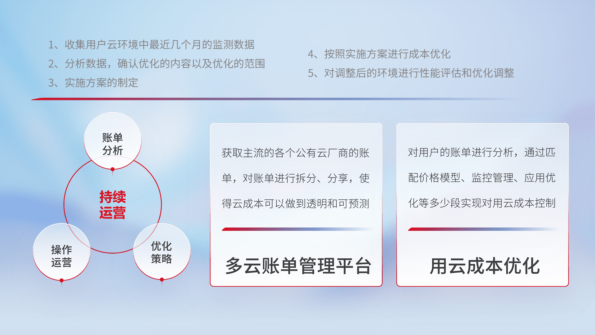通过多云纳管,,以统一的资源数据模型把客户的云资源进行抽象和封装,,,进而实现对多云资源的统一操作,,,,保障云资源管理的可靠性、、、、稳定性与可用性。。。。量身定制化运维内容,,配置、、开发运维、、补丁管理、、、备份、、、、监控、、认证和访问管理、、审计和日常巡检等,,保障在用云过程中的可靠度,,,,稳定度以及高可用率。。。。